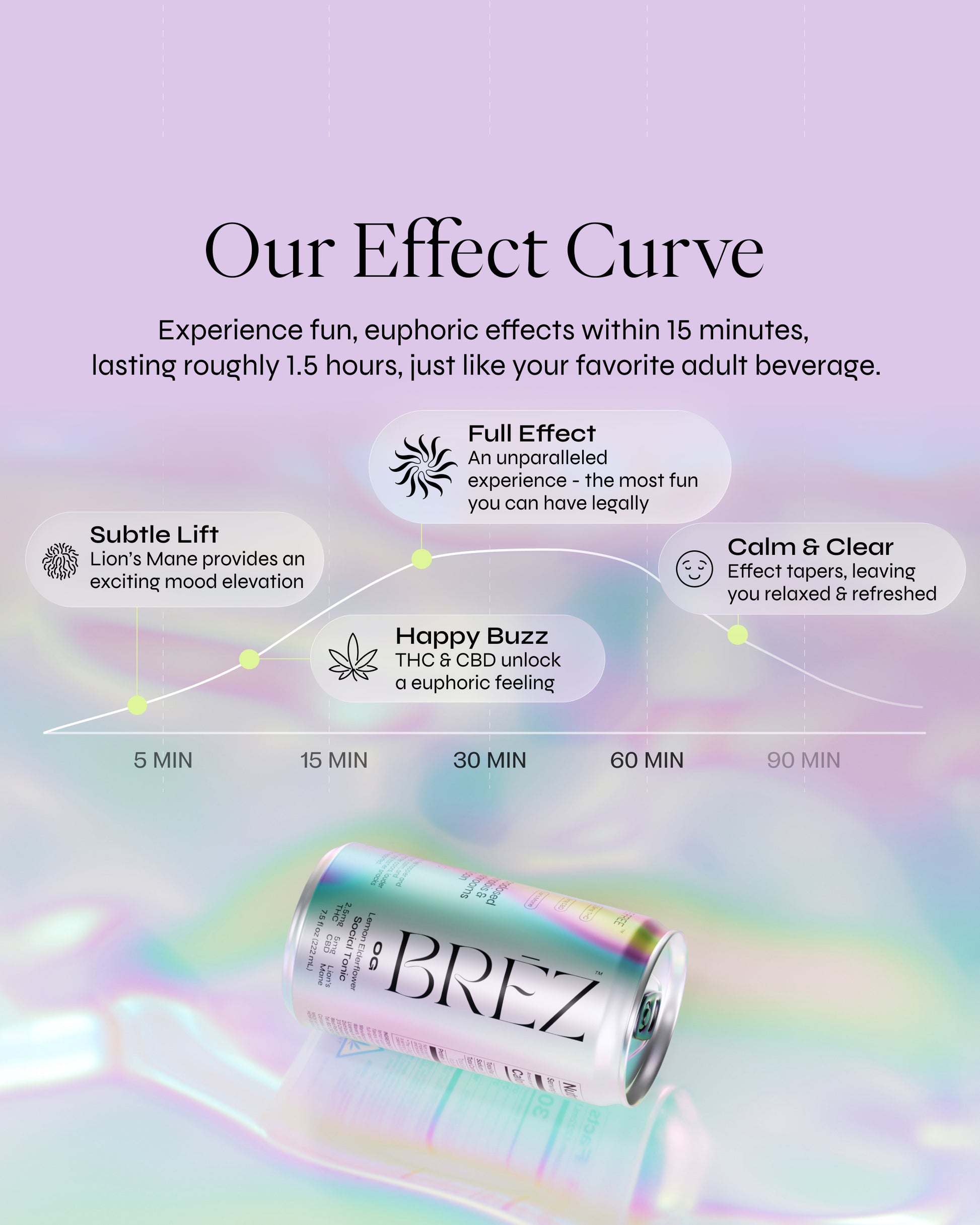 Our fast-acting formula acts like a true alcohol alternative. Experience fun, euphoric effects within 5-10 minutes, lasting roughly 1.5 hours, just like your favorite beer, seltzer, or glass of wine. The effect will feel both unique and familiar, making it the perfect choice for the sober-curious.
